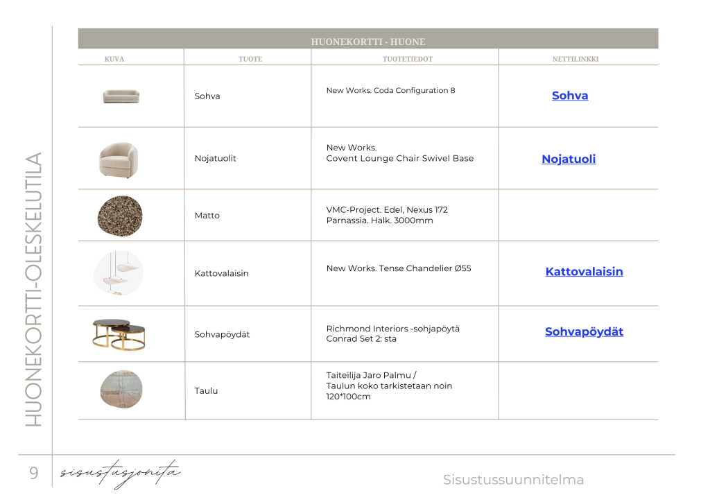 - tilaratkaisut, pintamateriaalit ja kiintokalusteet